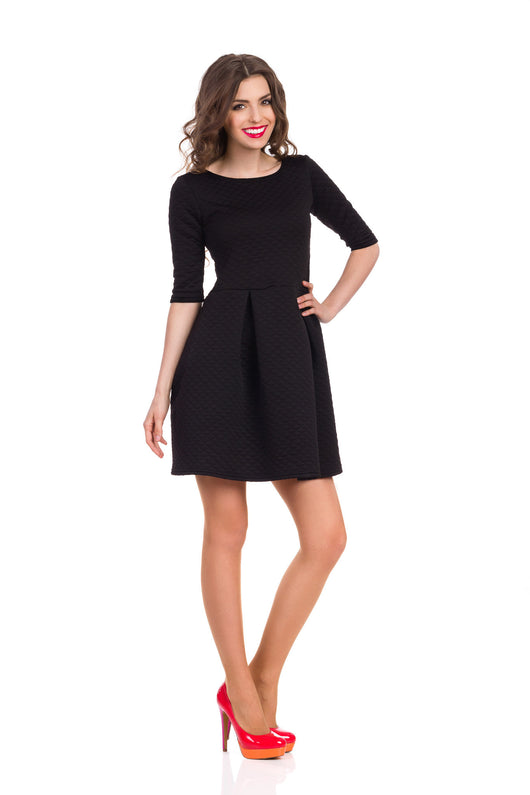 Black solid knitted A-line dress, has a round neck, three-quarter sleeves, embellished and crochet detailing, a tie-up detail on the back, a flared hemline