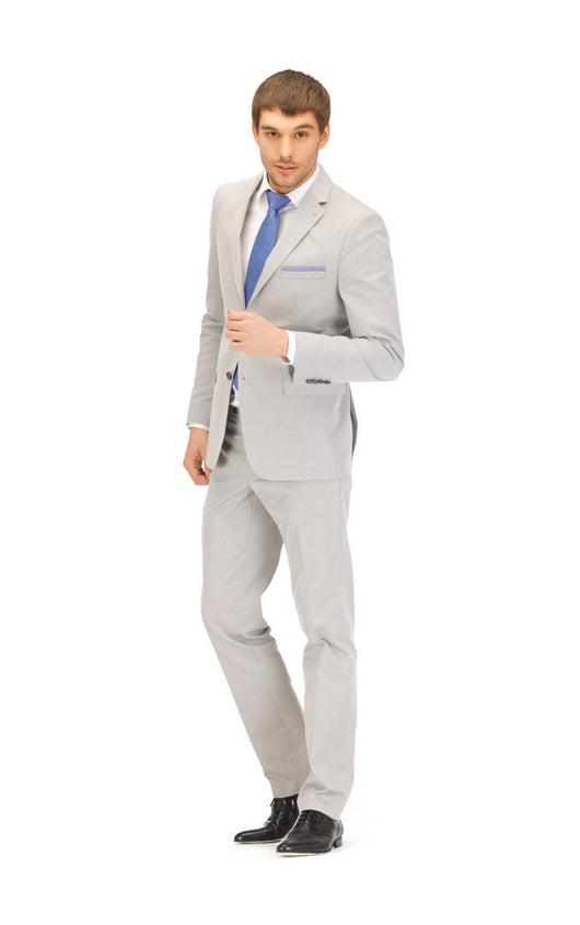 Grey formal blazer in a patterned weave, has a notched lapel, single-breasted with double button closure, long sleeves, three pockets, vented back hem, three pockets built into the lining